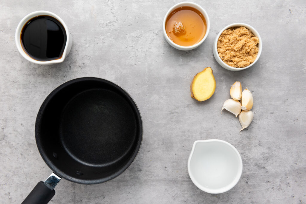 • Prepare the sauce. In a small saucepan, combine the soy sauce, ¾ of the water, minced garlic, grated ginger, honey, and brown sugar.