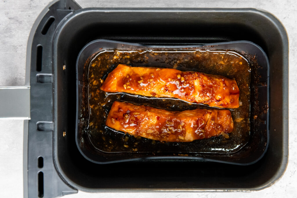 • Remove the marinated salmon from the refrigerator and place it in an air fryer-safe dish.
