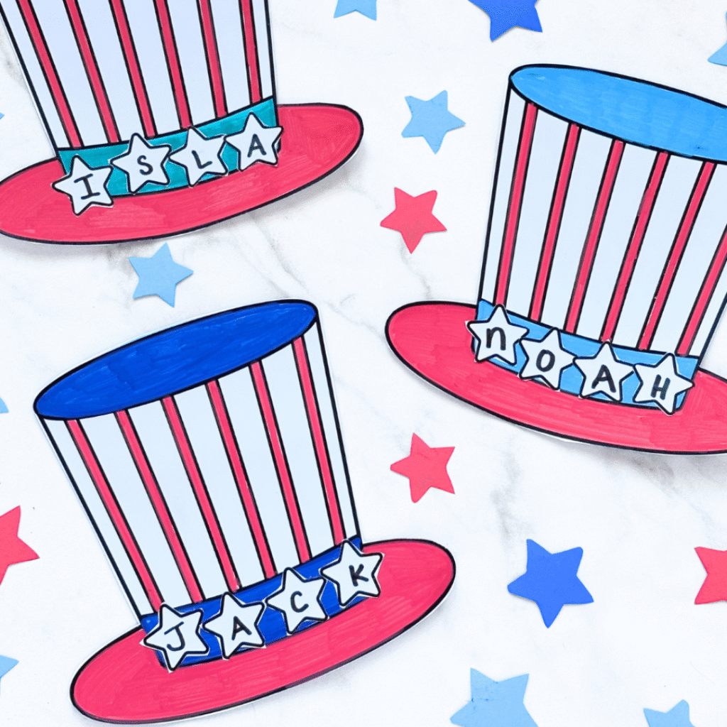 Let kids show off their patriotic pride—letter by letter! This Uncle Sam patriotic hat name craft is a star-spangled way to celebrate America as kids color, decorate, and spell out their names with bright stars and bold red, white, and blue.