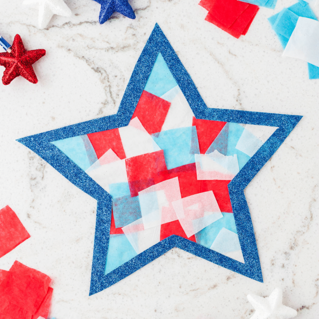 Quick and easy 4th of July or Memorial Day Star Suncatcher craft that are easy to make with a star template and look so pretty hanging in your windows! Simply cut out your star, apply it to contact paper and decorate with tissue paper. Easy kids craft perfect for summer!