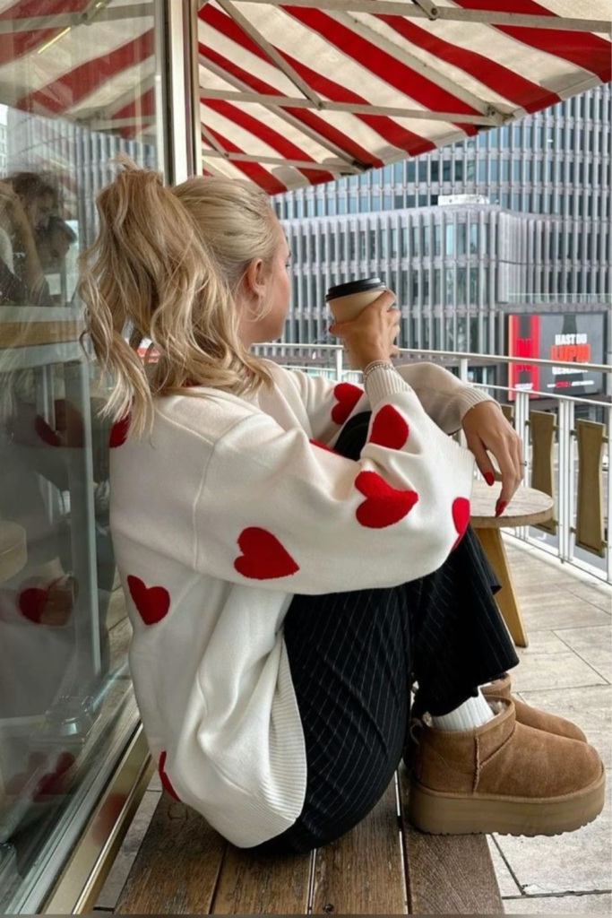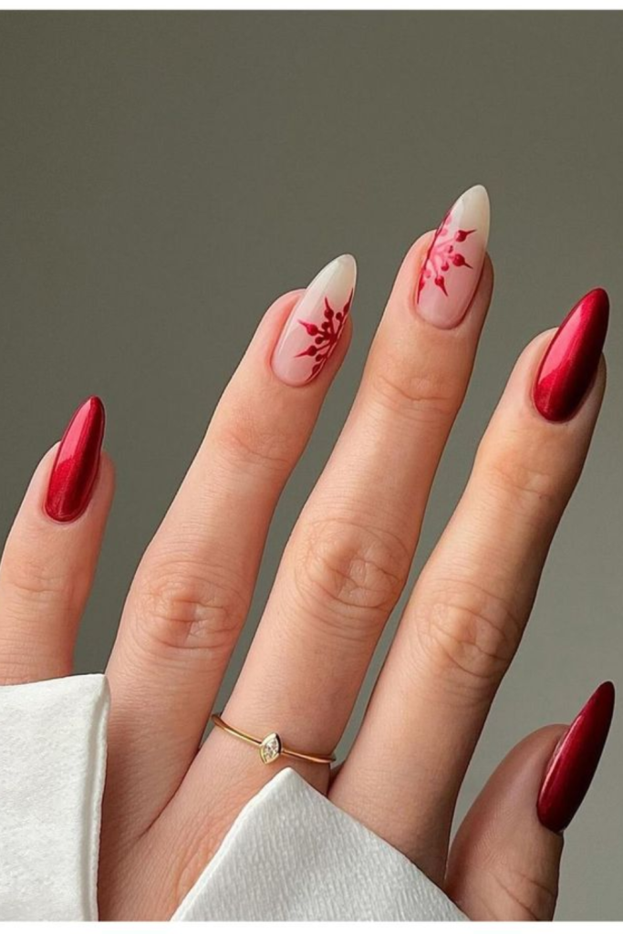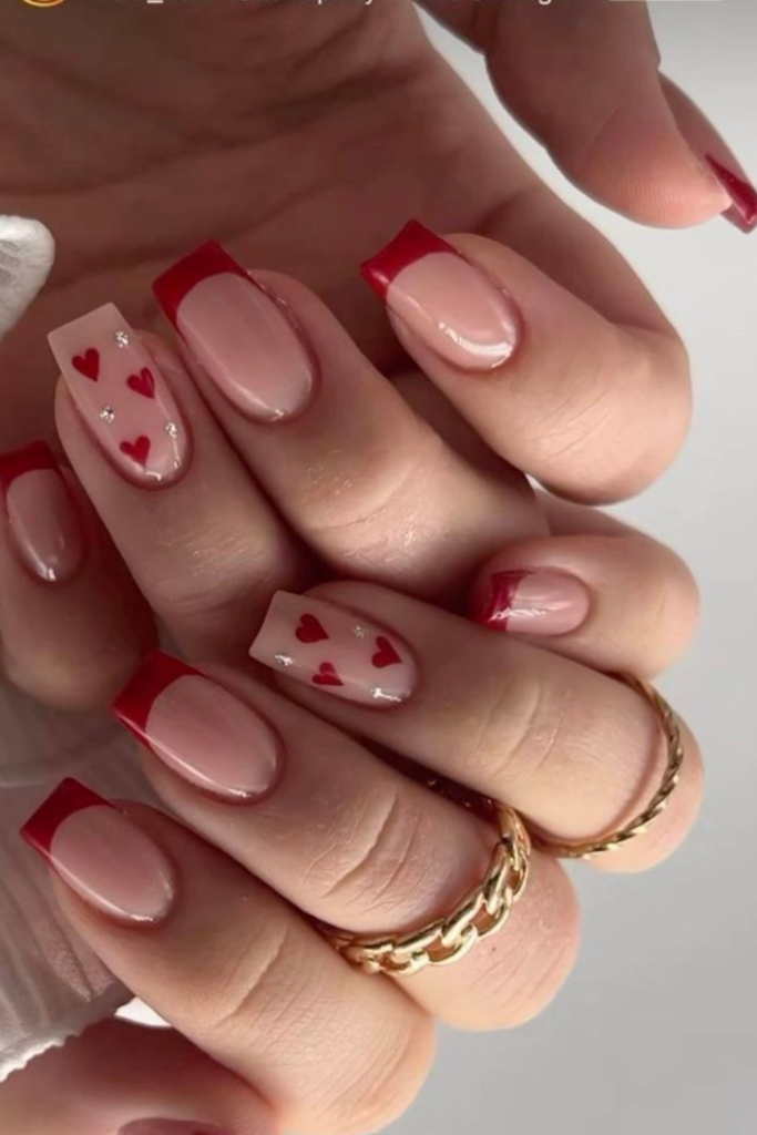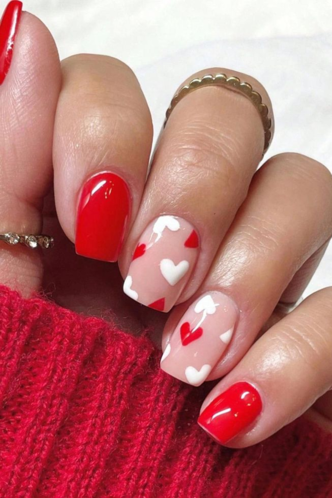 Add some variety to your look with bold red nails and a mix of red-and-white heart designs on the accent fingers. It’s equal parts chic and festive!