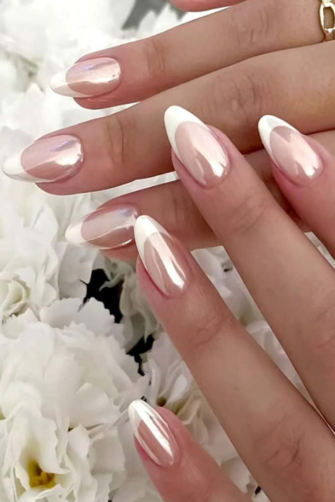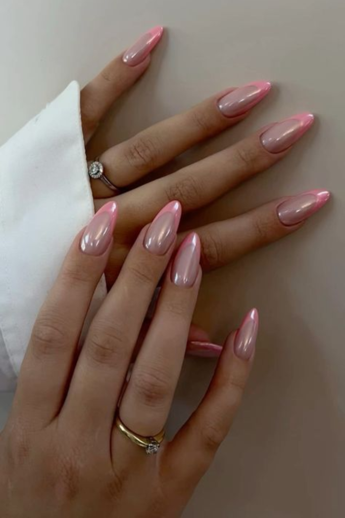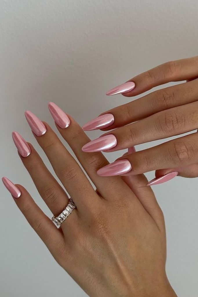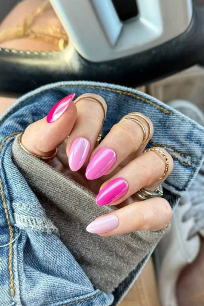 Can’t pick a single shade of pink? Go for them all! Each nail shines in a different tone of pink chrome, creating a stunning, monochromatic Valentine’s dream.