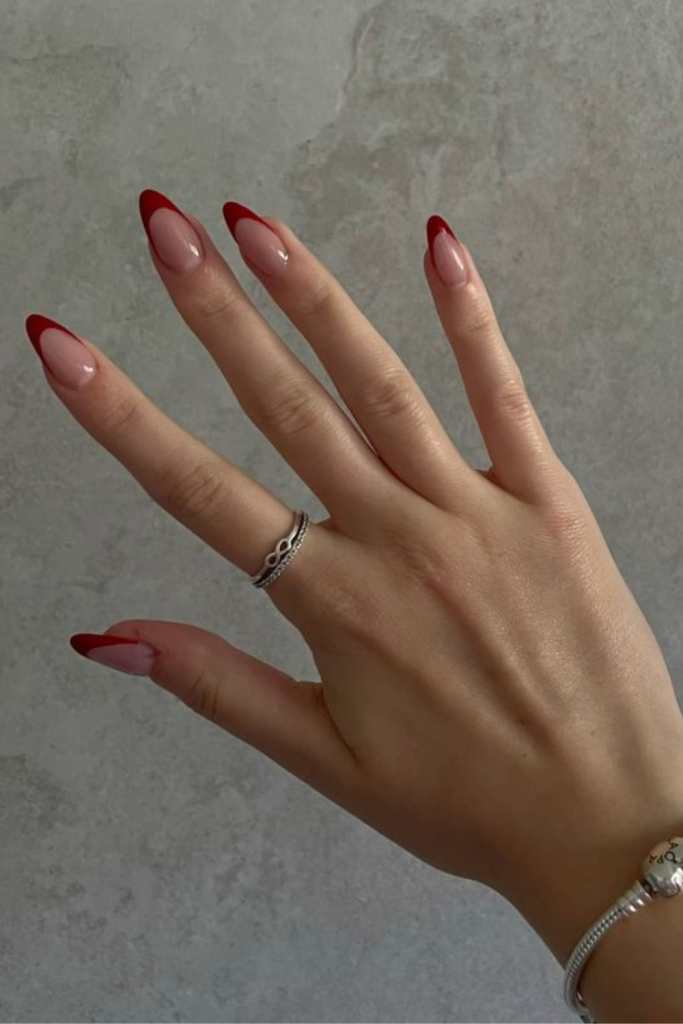 This look screams classic Valentine’s Day vibes with a modern twist. A bold red French tip on almond-shaped nails is sleek, timeless, and oh-so-romantic. Perfect for those who want to keep it simple yet striking!
