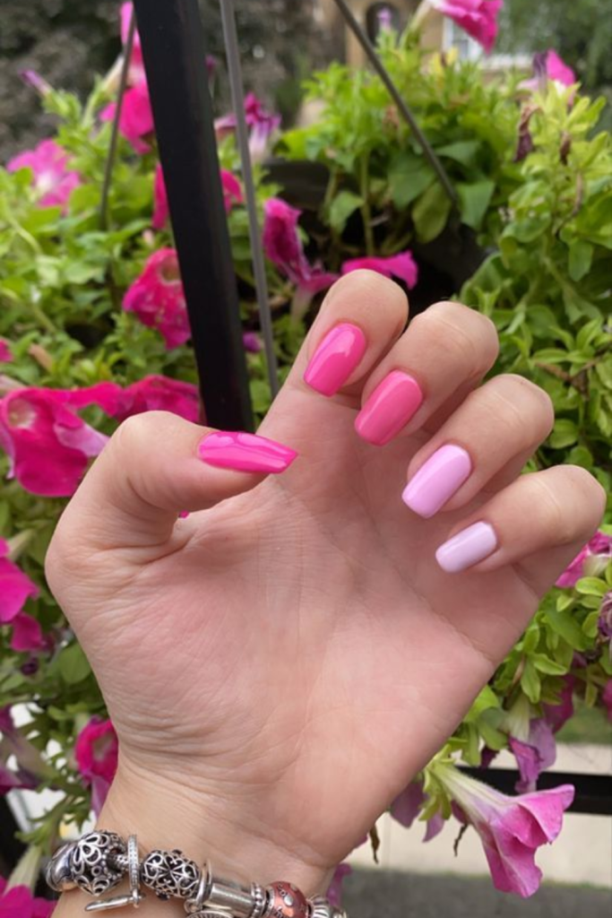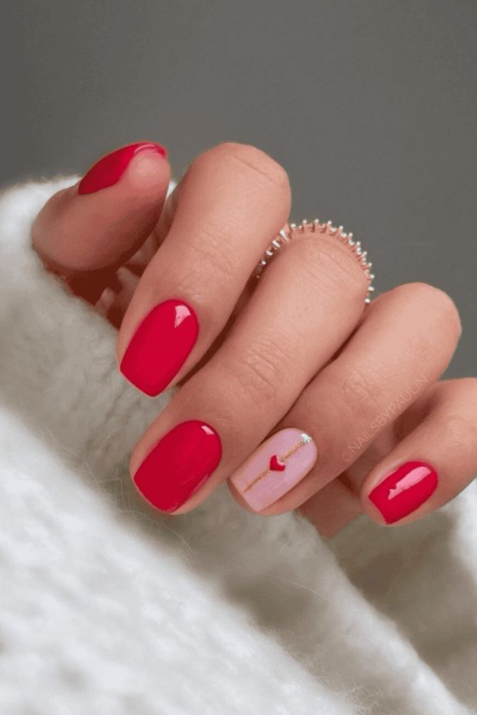 If pink is your love language, this one’s for you. Go for square nails in varying shades of pink for a simple yet stunning Valentine’s Day manicure that feels fresh and modern.