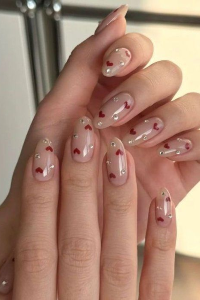 Glam it up! Nude almond nails with red hearts and sparkly gems on each finger scream “I’m celebrating love in style!” This look is perfect for anyone who loves a little extra sparkle.