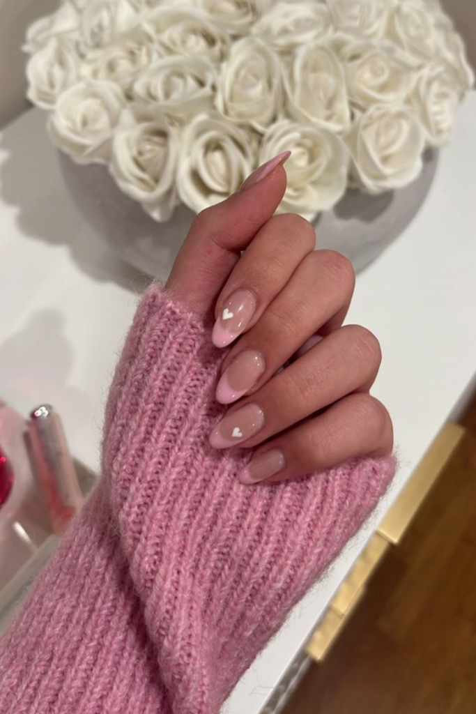 Soft and dreamy, this pastel pink manicure features white heart accents for a delicate, romantic vibe. It’s giving fairy tale romance but make it nails!