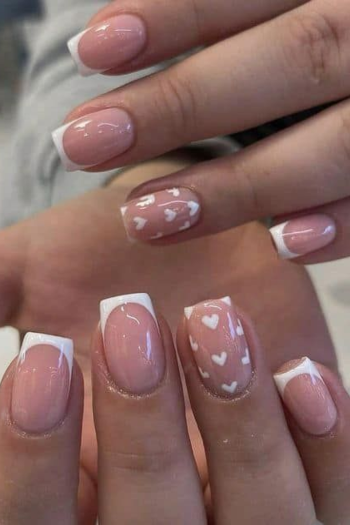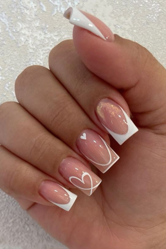 Want a modern twist? Add an abstract heart design to one finger while keeping the rest classic with white French tips. It’s artsy, stylish, and just a little edgy!