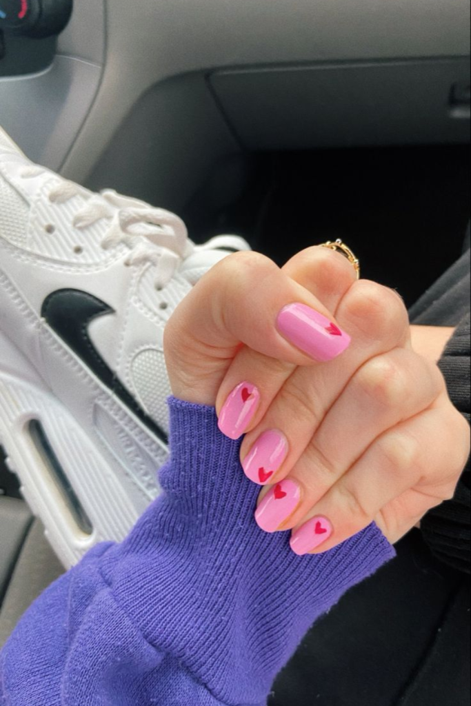 Keep it short, sweet, and straight to the point! These pale pink nails with small red hearts on each finger are a fun way to spread the love—one nail at a time.