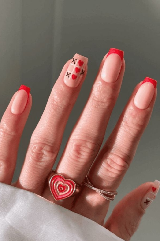 Game on! A red French tip gets extra fun when paired with an accent nail featuring a tic-tac-toe design—where the O’s are tiny hearts. This look is as playful as it is adorable.