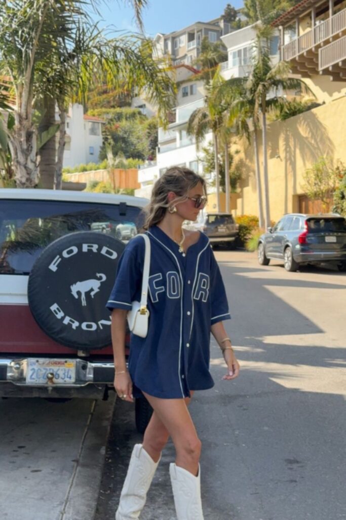 Pair a team jacket over a fitted crop top and denim shorts, and top it off with a pair of cowboy boots. Yes, cowboy boots—because why not? It screams trendy with a touch of yeehaw.