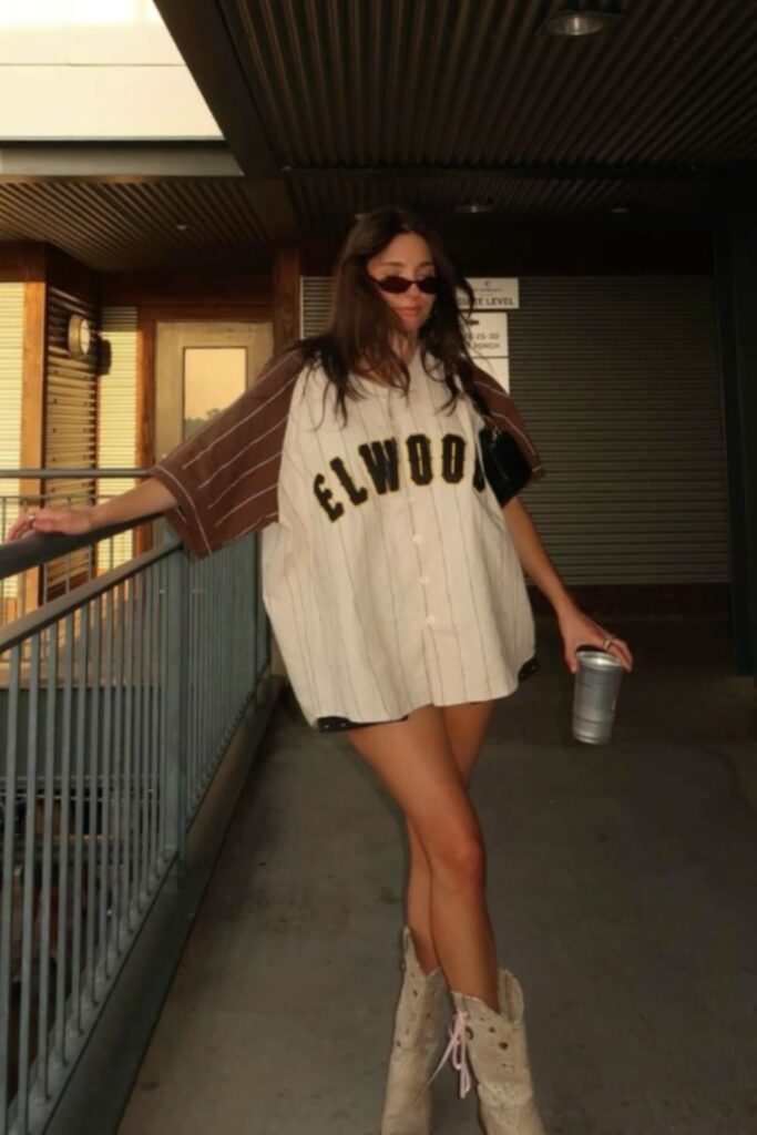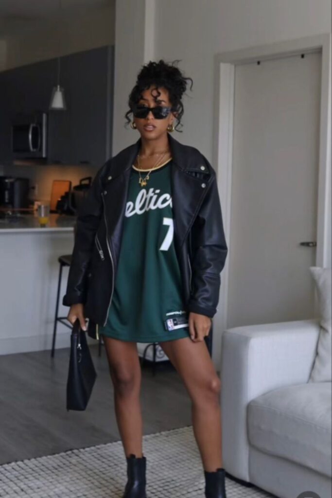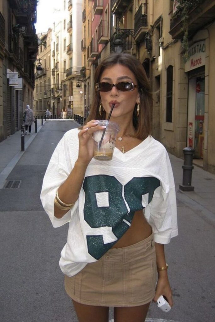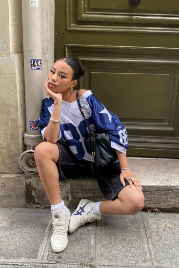 This is a “I know my team stats and my outfit ate” kind of look. Think oversized football jersey, baggy jeans or cargos, chunky sneakers, and a slicked-back bun or baseball cap. For girlies who love comfy fits but still want that cool-girl game day vibe.