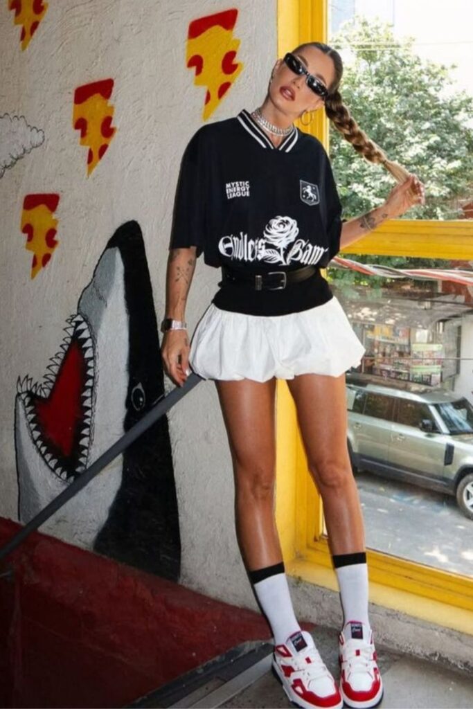 The retro jersey brings that throwback football vibe, while a pleated mini skirt adds movement and a girly twist that makes the outfit feel styled, not just “I threw on my merch.” It’s giving full main-character energy!