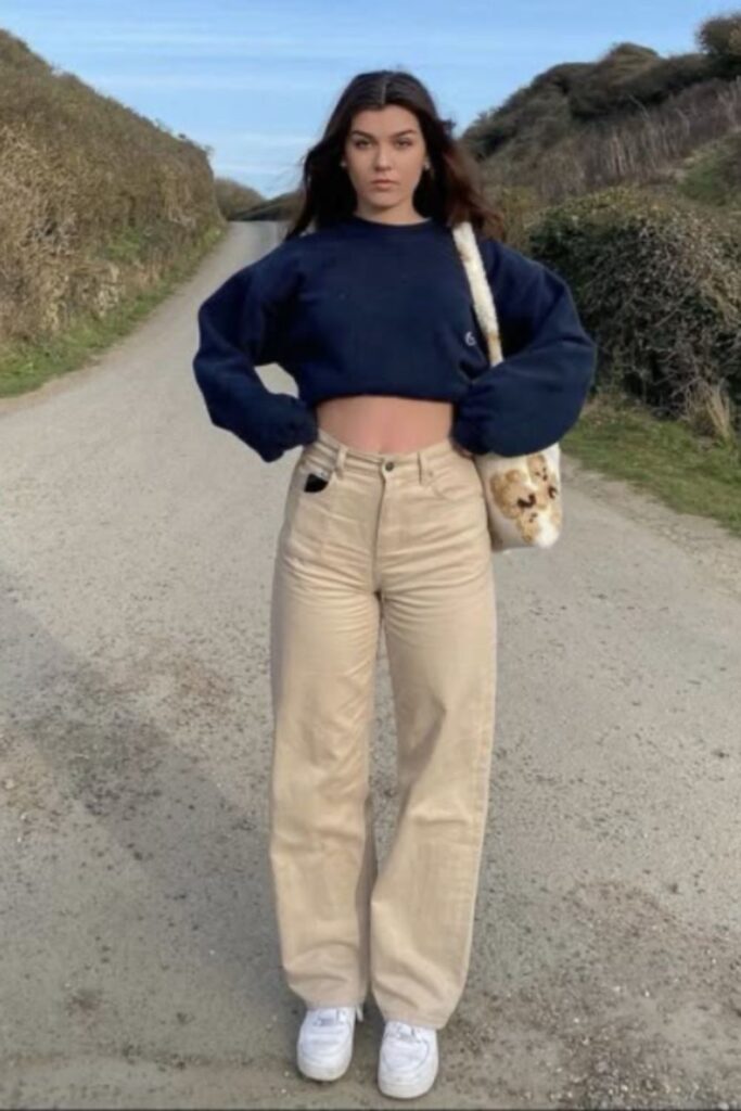 An oversized sweatshirt paired with beige pants is the definition of relaxed aesthetic style. It feels cozy and effortless while still looking intentionally put together. This is the perfect outfit for casual days when you still want to look chic.