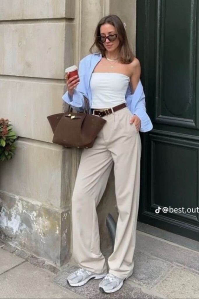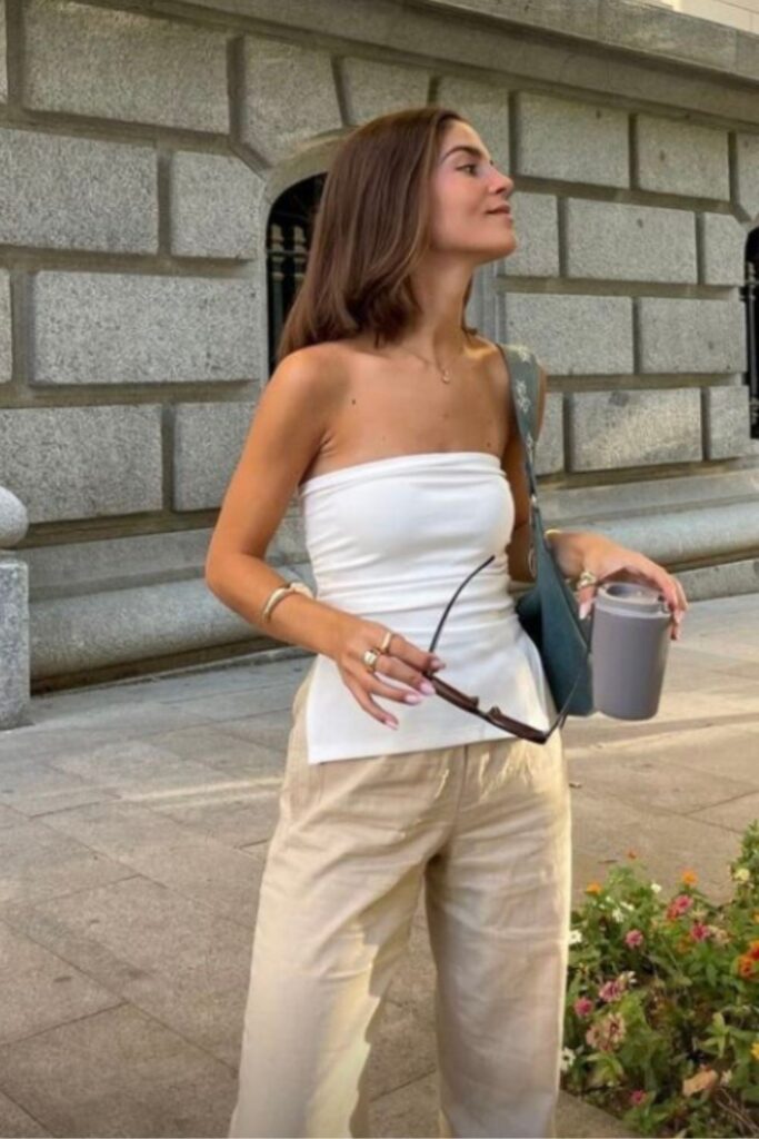 A tube top with pants is simple, clean, and always flattering. It’s minimal but still makes a statement because of how sleek it looks together. This is a go-to outfit when you want something easy but still stylish.