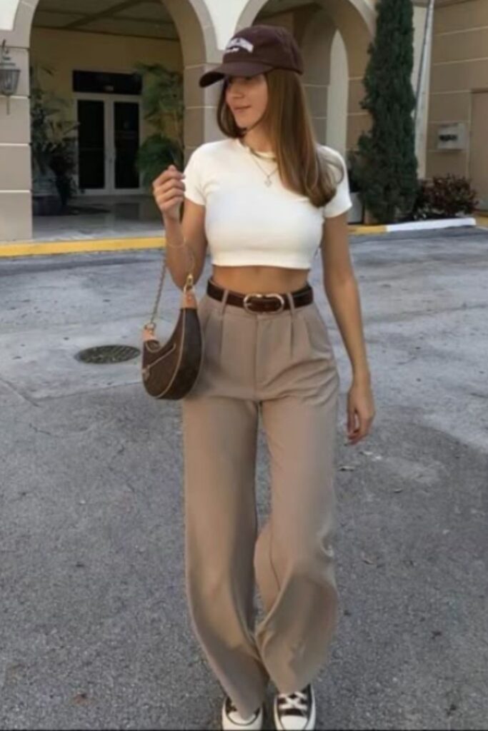 A crop tank top with pleated pants is that minimal-chic look everyone secretly wants to copy. It’s breezy, flattering, and the type of fit that goes from errands to a dinner date seamlessly.