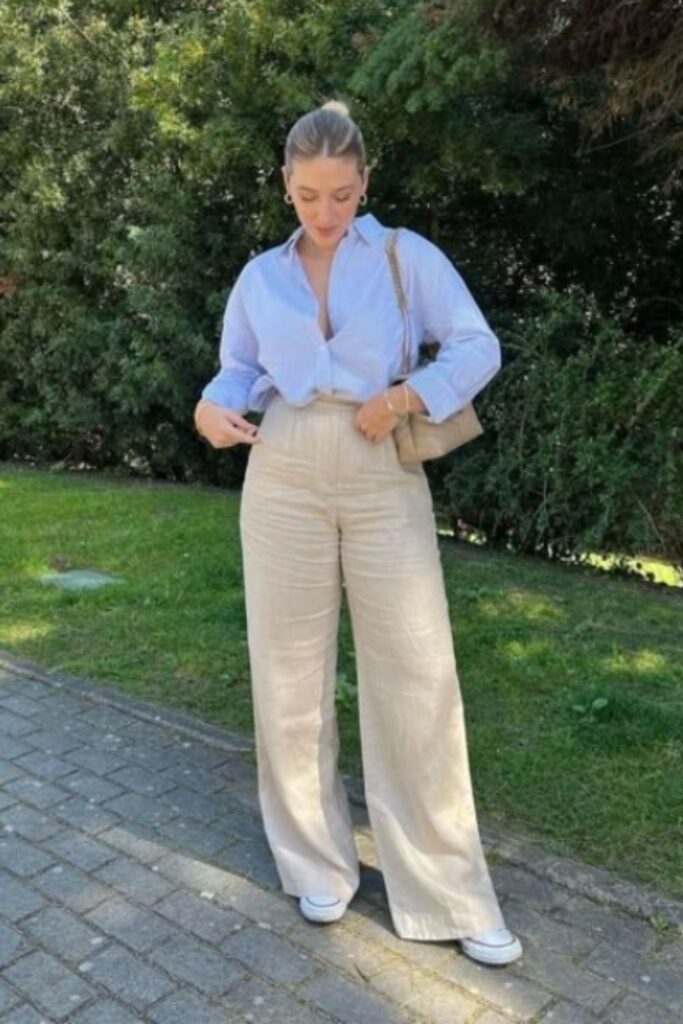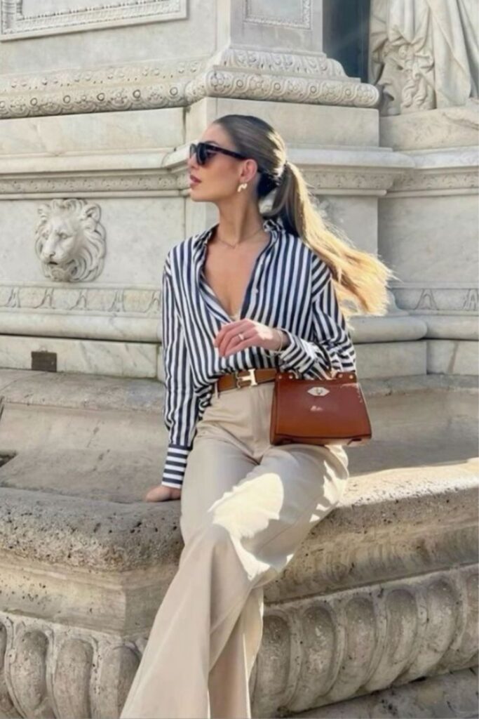 A striped shirt paired with pants gives that timeless, slightly Parisian-inspired vibe. It’s classic, easy, and always looks like you made an effort even when you didn’t. This combo is perfect for everyday wear when you want simple but stylish.