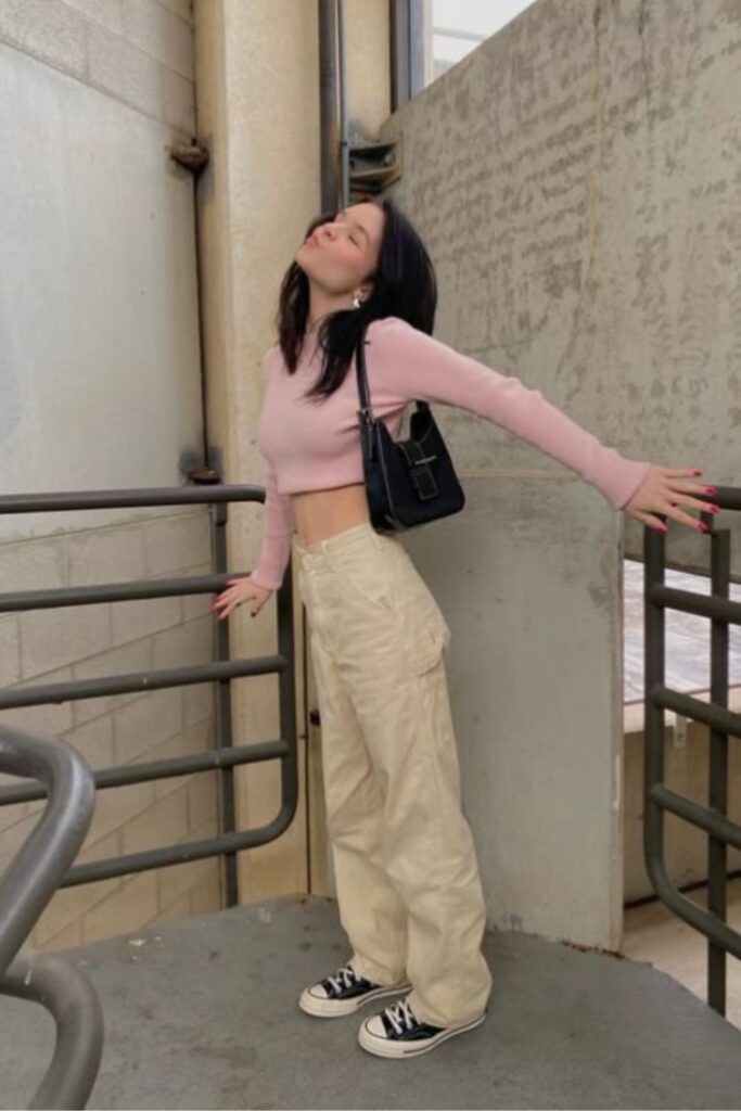 A crop top paired with cargos is the definition of easy street-style cool. It’s relaxed but still a little flirty, which makes it perfect for casual days when you still want to look put together. Think off-duty energy with just the right amount of edge.