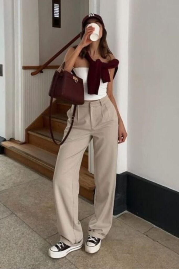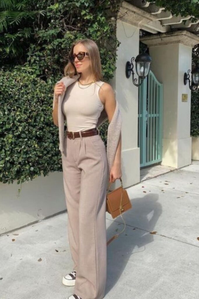 A vest top with pleated pants gives that effortlessly refined, modern tailoring feel. It’s clean, structured, and instantly makes you look more polished without trying too hard. This is the kind of outfit that works perfectly for both daytime plans and elevated evening moments.