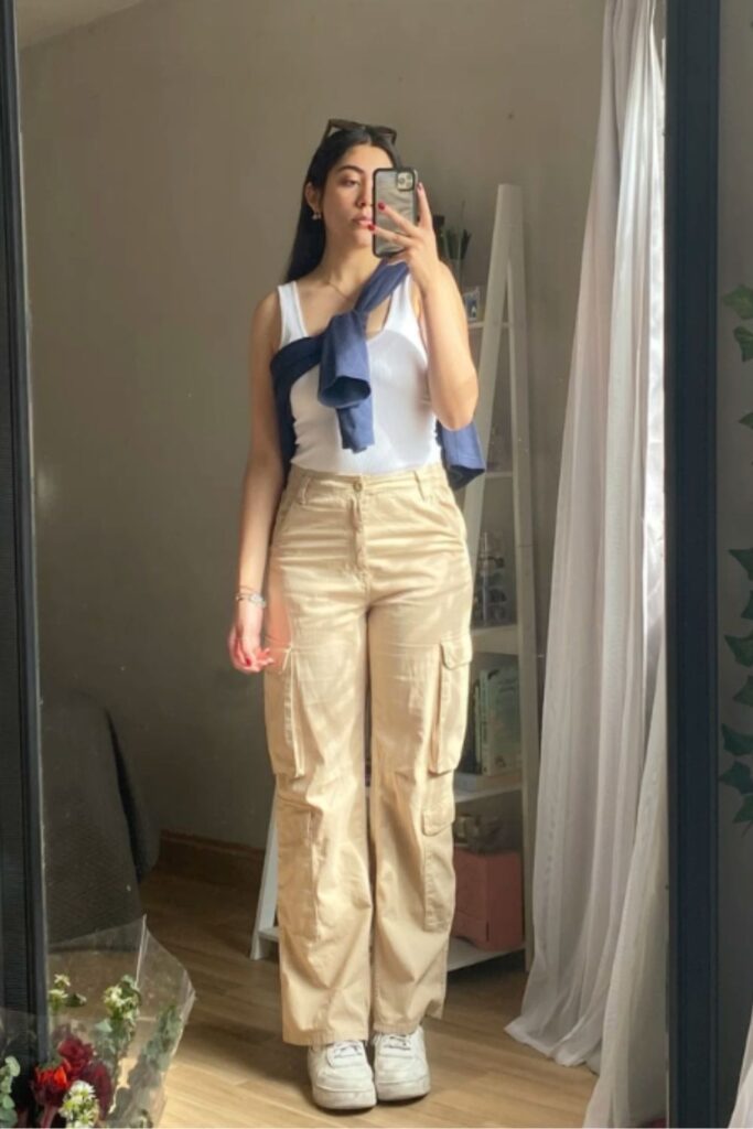 A tank top with cargos brings that nostalgic Y2K energy in the best way. It’s sporty, minimal, and effortlessly cool without needing much styling. This is the kind of outfit you throw on and still somehow look like you stepped out of a fashion shoot.