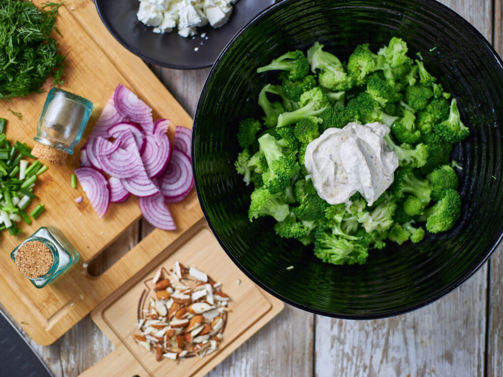 Step 7: Assemble the salad: In a large serving bowl, add the cooled, dried broccoli, crumbled feta, sliced red onion, toasted almonds, chives, and dill.