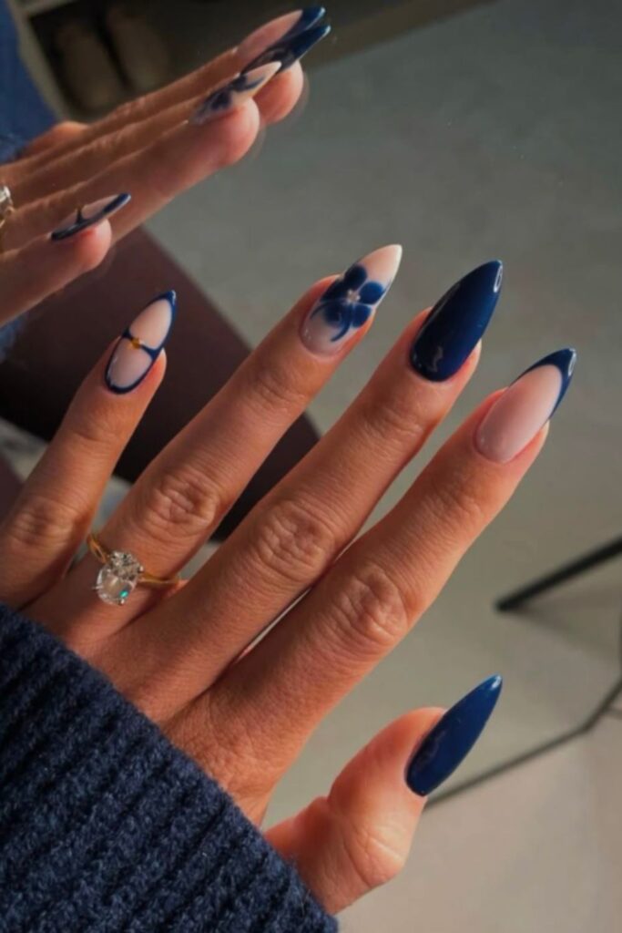 Take your almond French tip nails to the dark side… in the BEST way! Midnight blue glitter paired with a glossy nude base creates a dramatic, nighttime-ready manicure.
