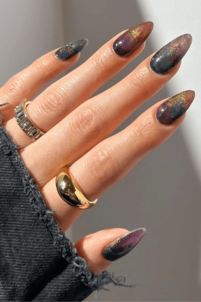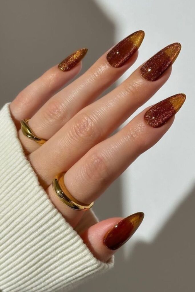 The mani that Hailey Bieber made went viral! Glazed donut nails are trendy for a reason. A glossy, shimmery coat over almond acrylic nails is a chef’s kiss. Add a fall brown base for that perfect slicked-glaze look.