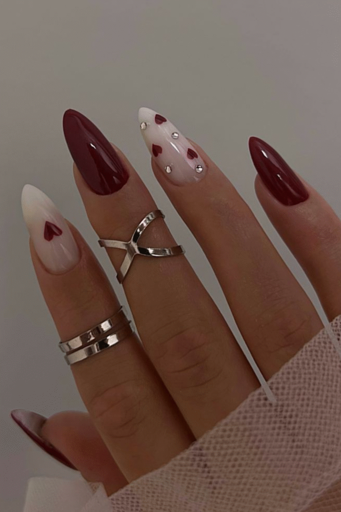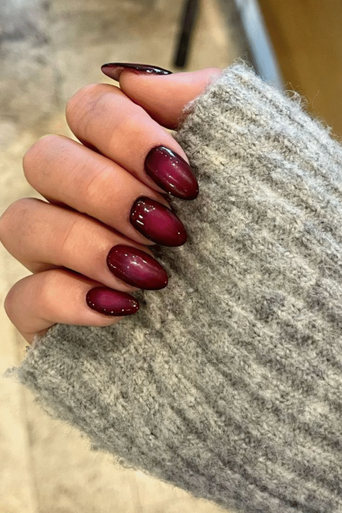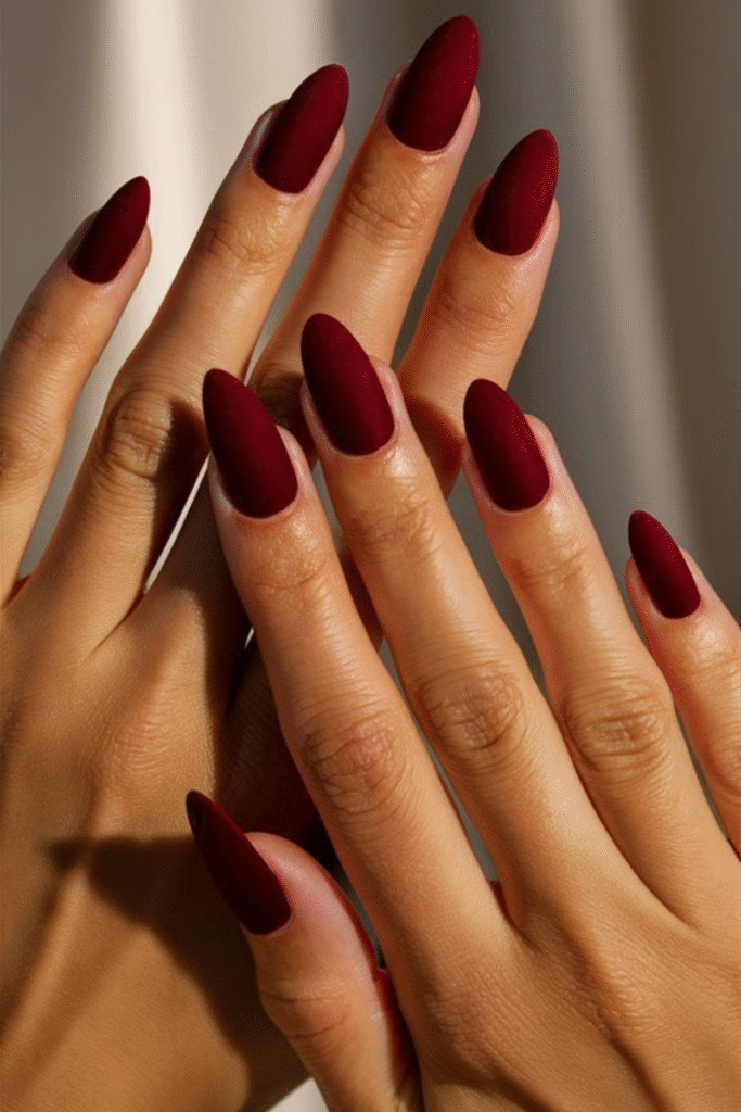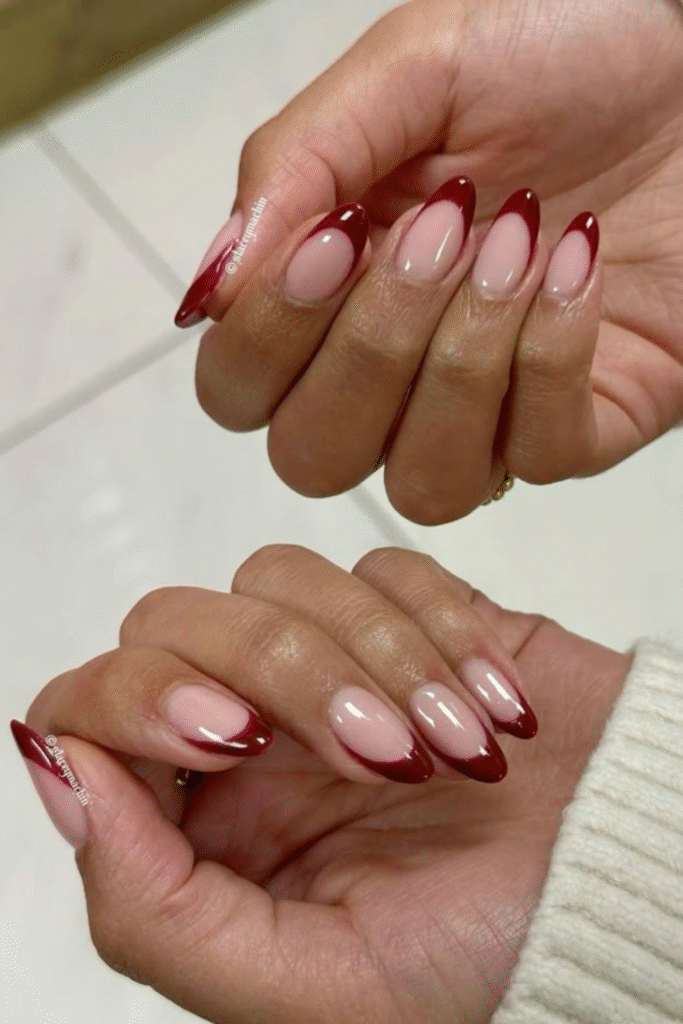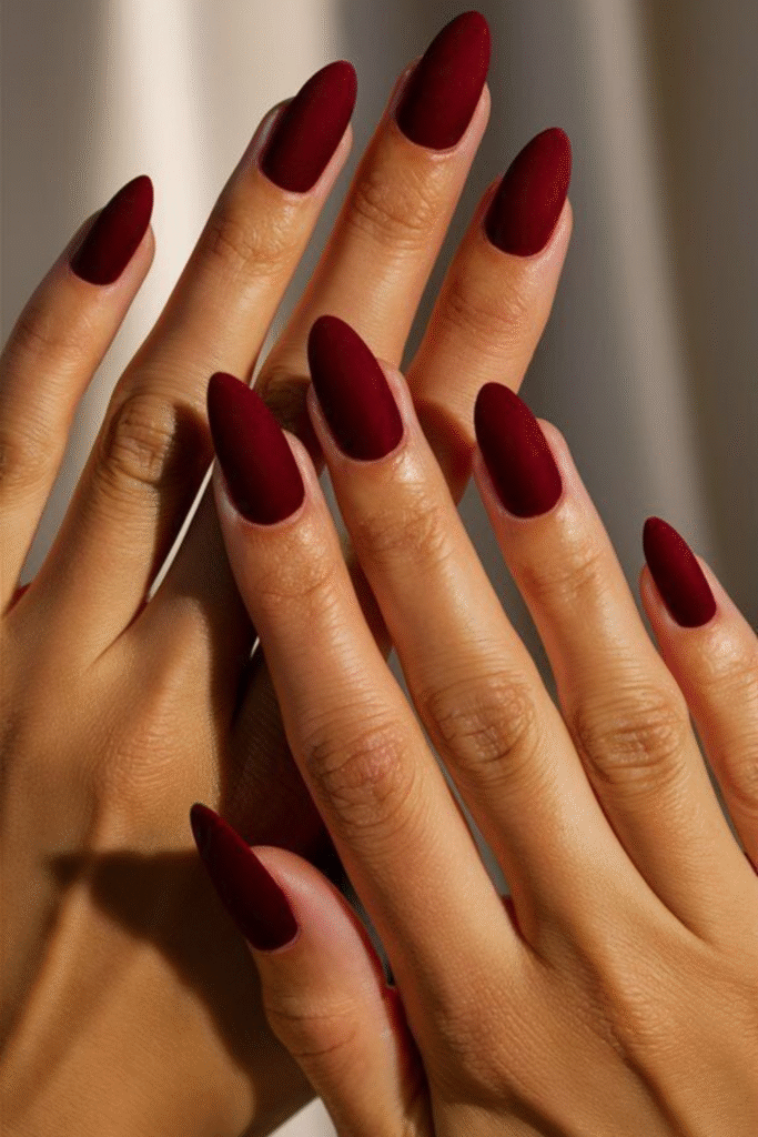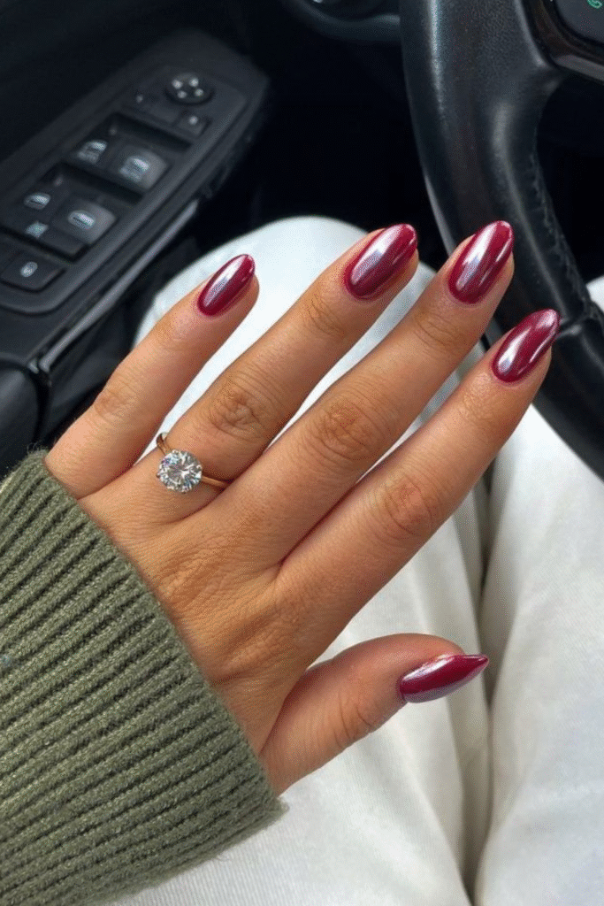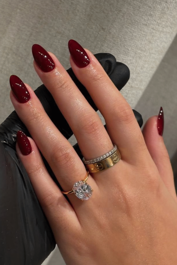 Deep wine nails feel cozy and luxe, especially during colder February days. They’re subtle but still make a statement.