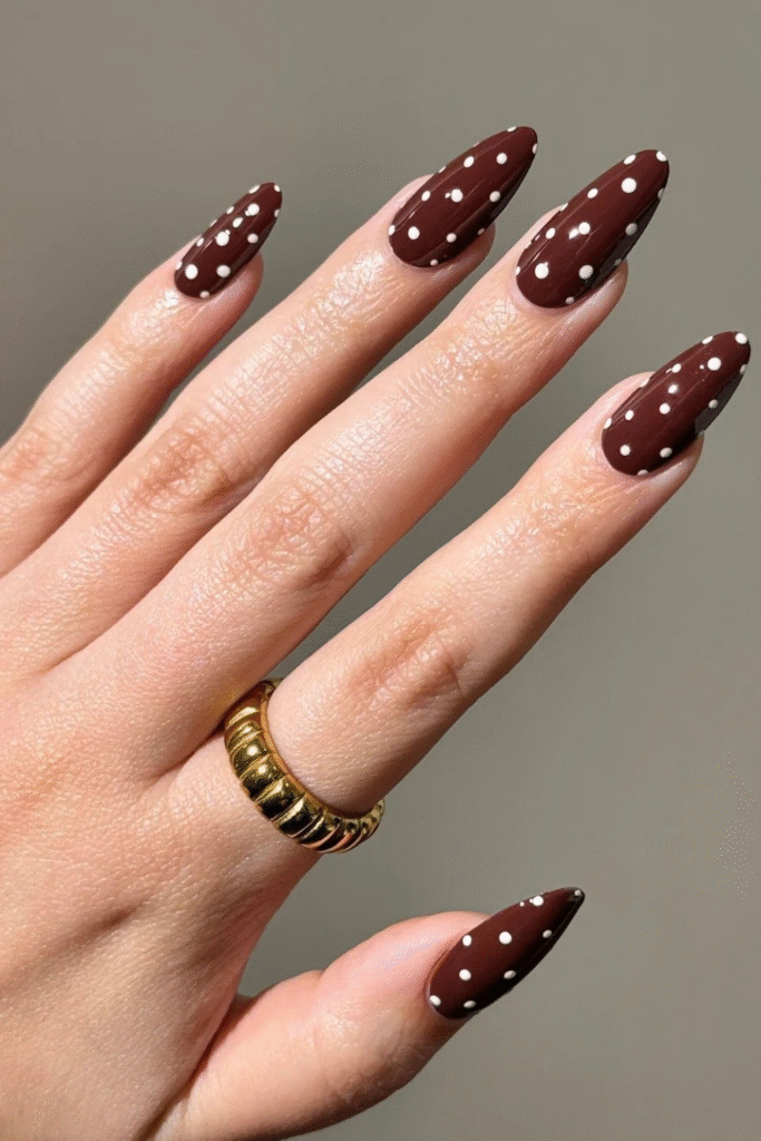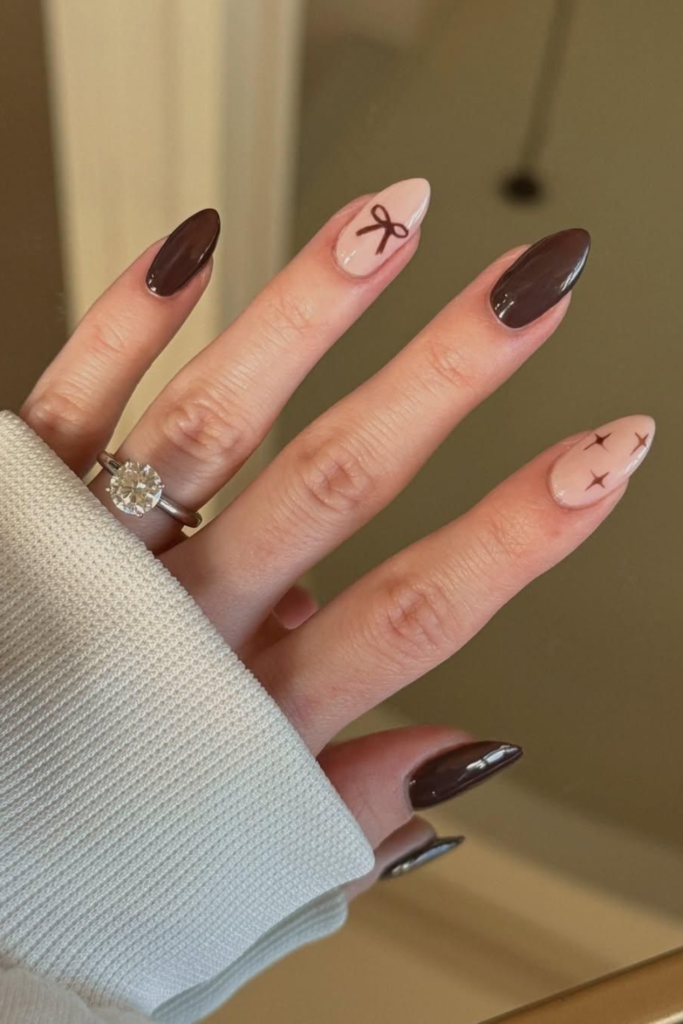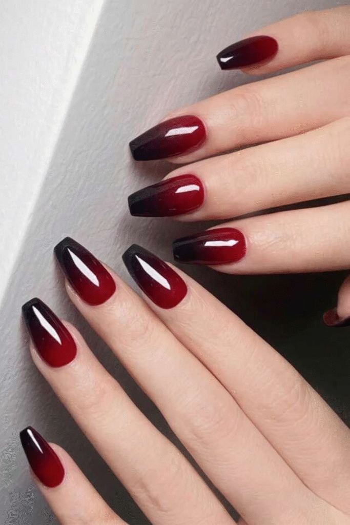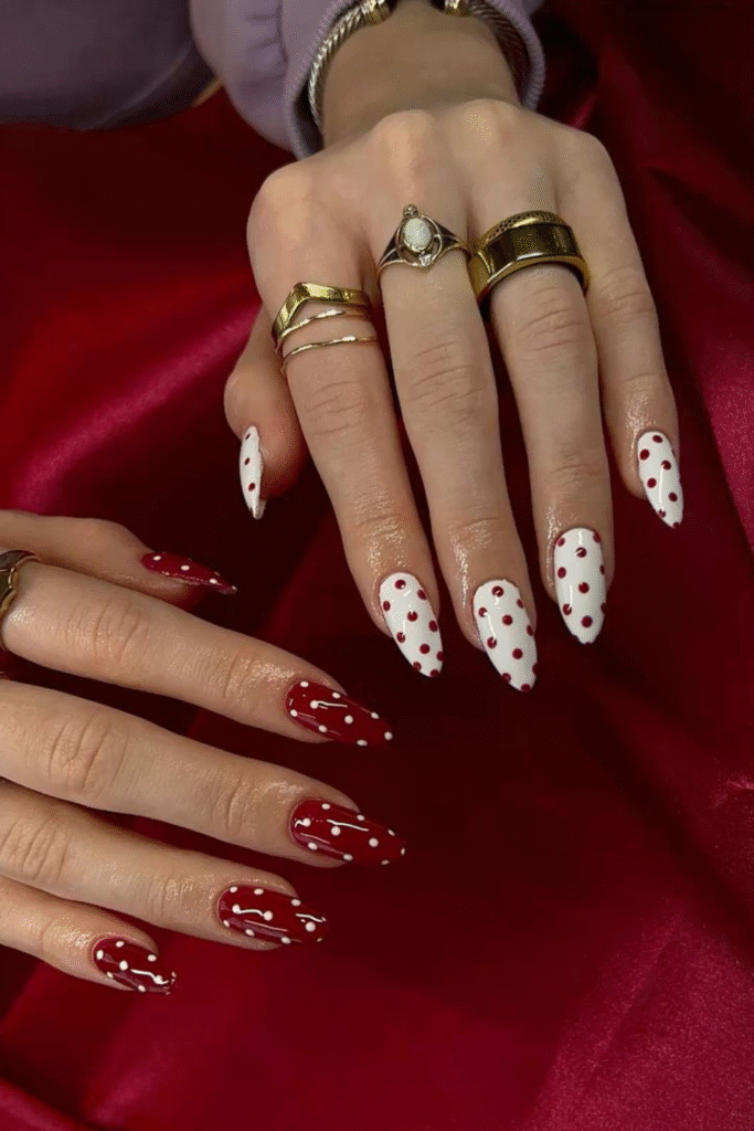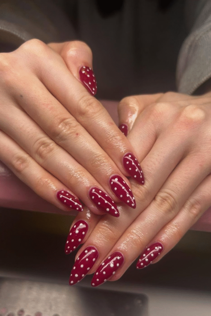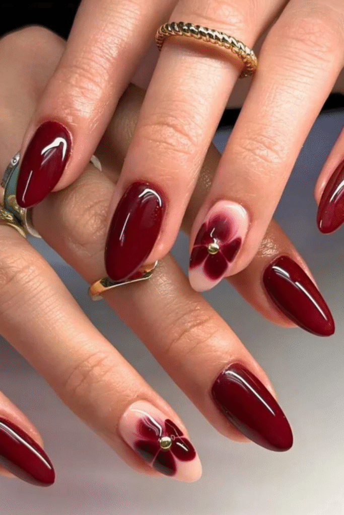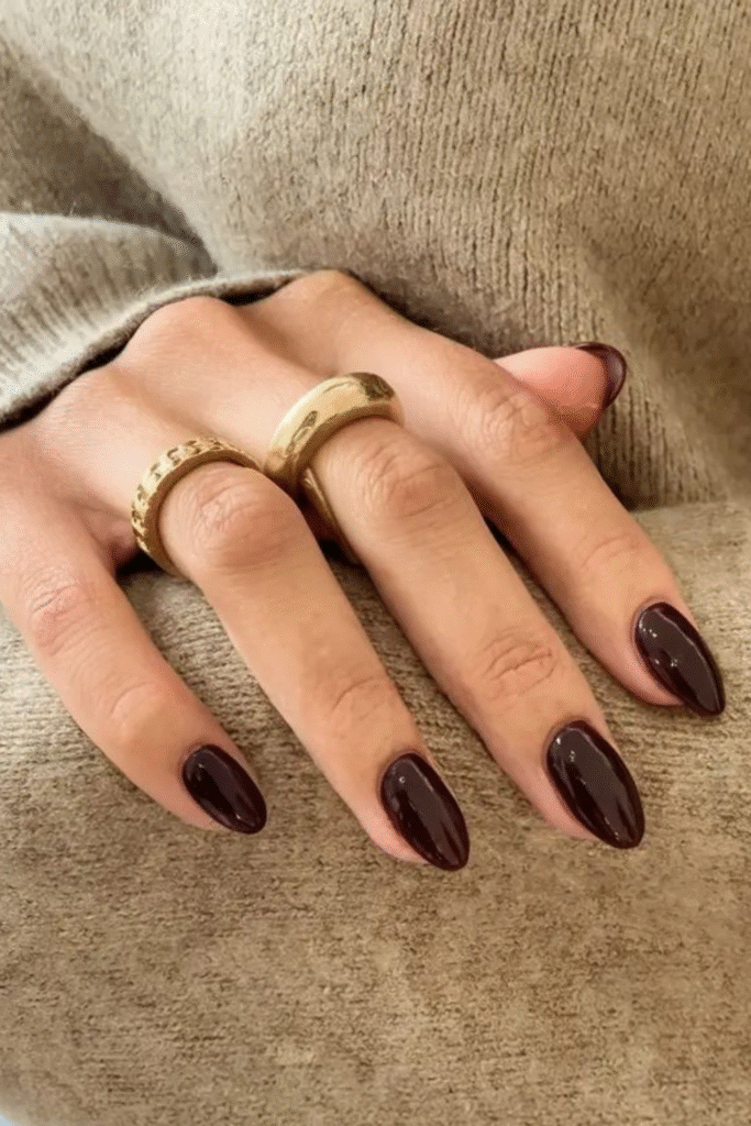Deep wine nails feel cozy and luxe, especially during colder February days. They’re subtle but still make a statement.