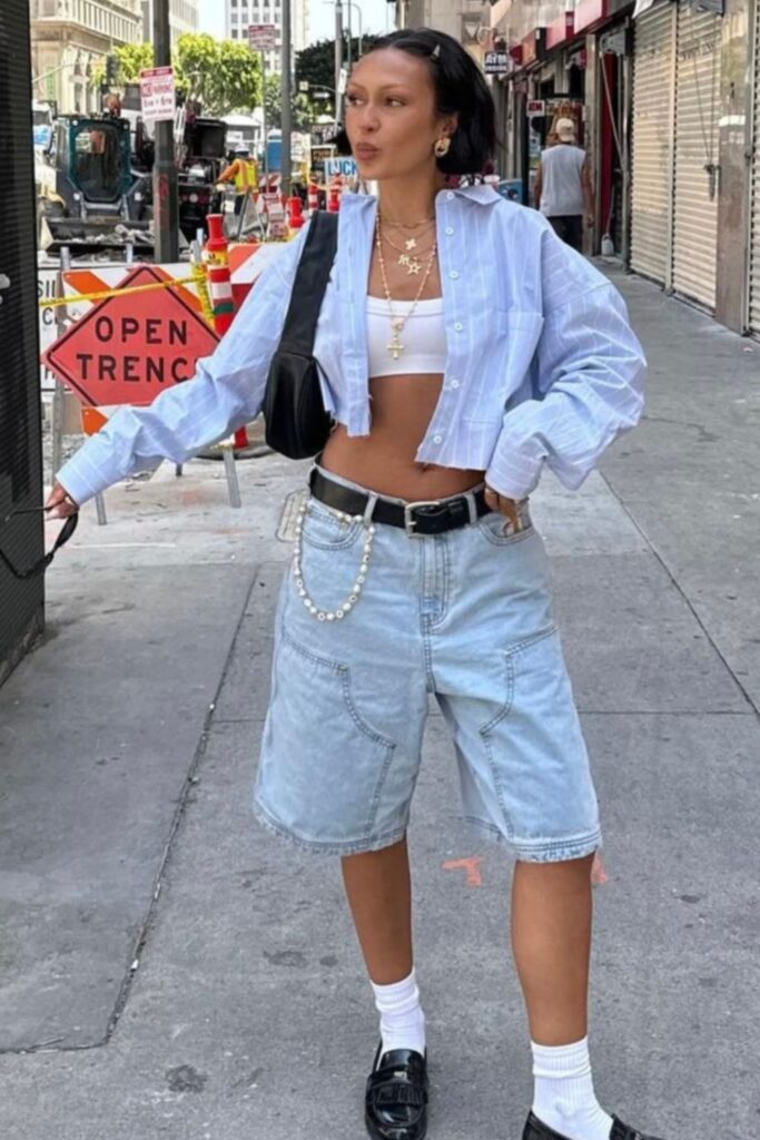 The oversized satin shirt layered over a crop top and mini skirt is giving model-off-duty. The satin keeps it luxe while the mini skirt makes it playful. It’s a layering formula that never fails to look cool and polished.