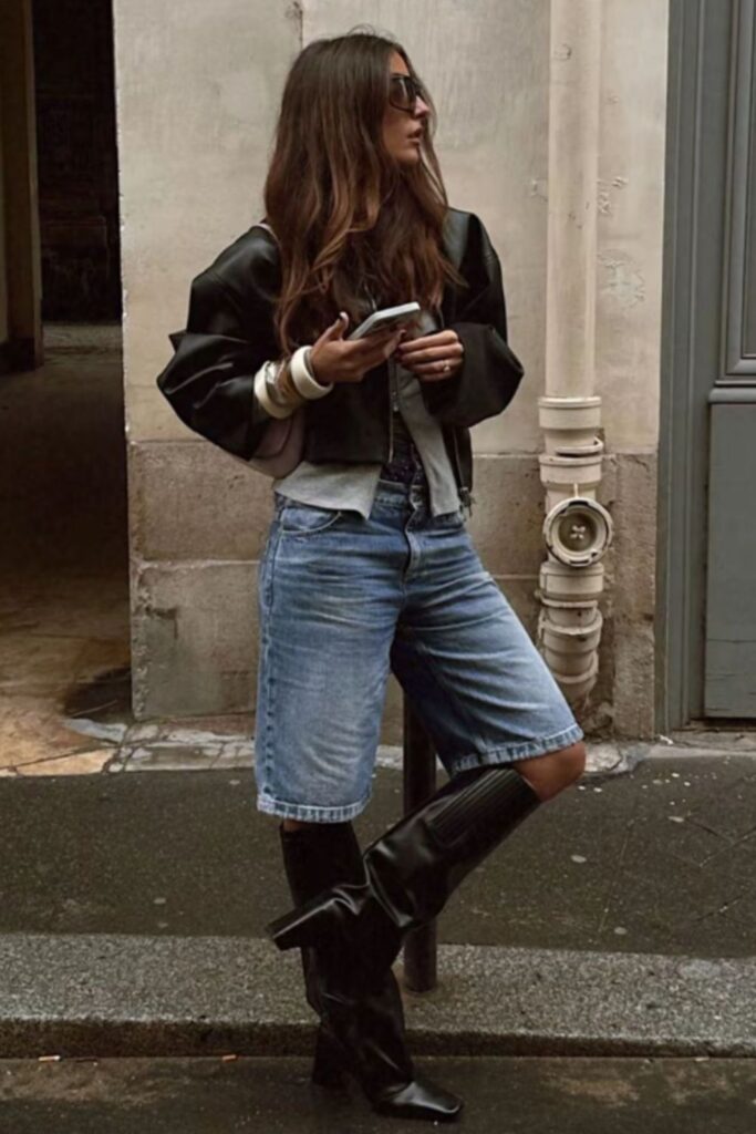 The denim jacket with crop tee and mini skirt combo is casual-cool at its finest. It’s flirty, fun, and great for those in-between weather days. Add sneakers, and you’re ready to slay.
