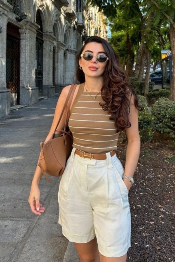 Relaxed yet trendy, the linen shirt over a tube top and mini skirt feels fresh and breezy. It’s giving summer brunch, beach town chic, or casual-day-cute.