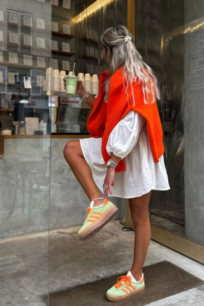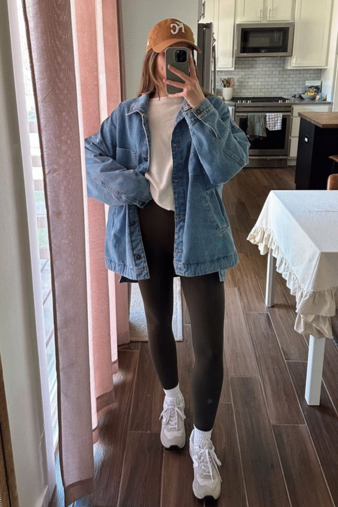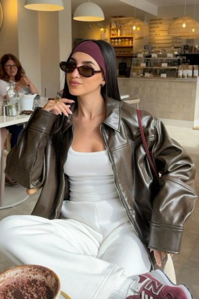 A baggy white tee with sneakers and baggy jeans creates the ultimate relaxed outfit. It’s giving effortless and streetwear-inspired without feeling sloppy. Add some gold hoops or a baseball cap if you want to dress it up just a little.
