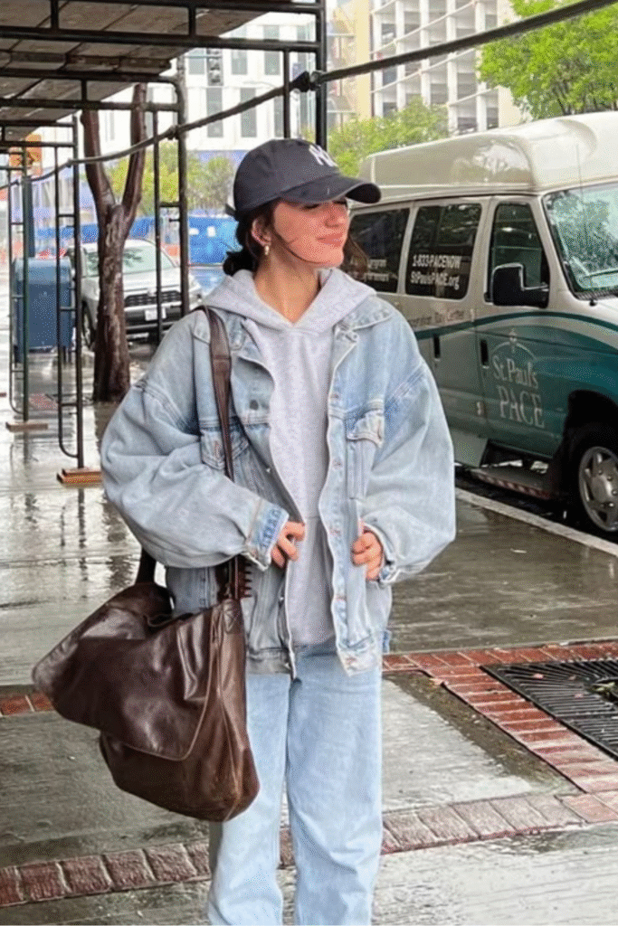 This combo is as simple as it gets—but still super cute. Baggy jeans with a baby tee and sneakers make for the perfect everyday uniform. It’s casual but doesn’t compromise on style.