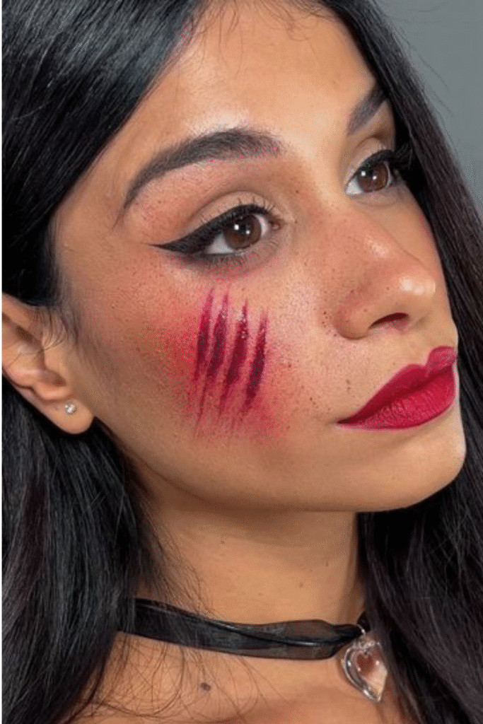 A small claw mark on your face looks fierce without being over-the-top. You can literally make this effect with the edge of a fork and some fake blood. It’s quick, easy, and gives instant spooky vibes without needing a full costume.