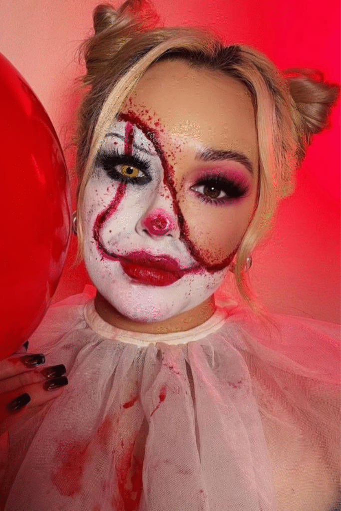Nothing terrifies quite like Pennywise. With exaggerated clown lines, smudged red lipstick, and a sharp stare, you’ll instantly channel pure nightmare fuel. Bonus points if you carry around a red balloon.