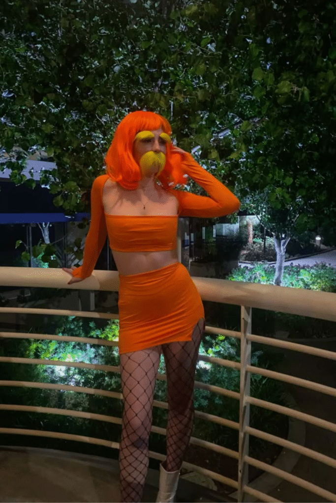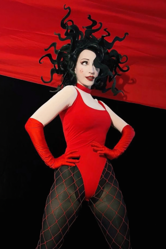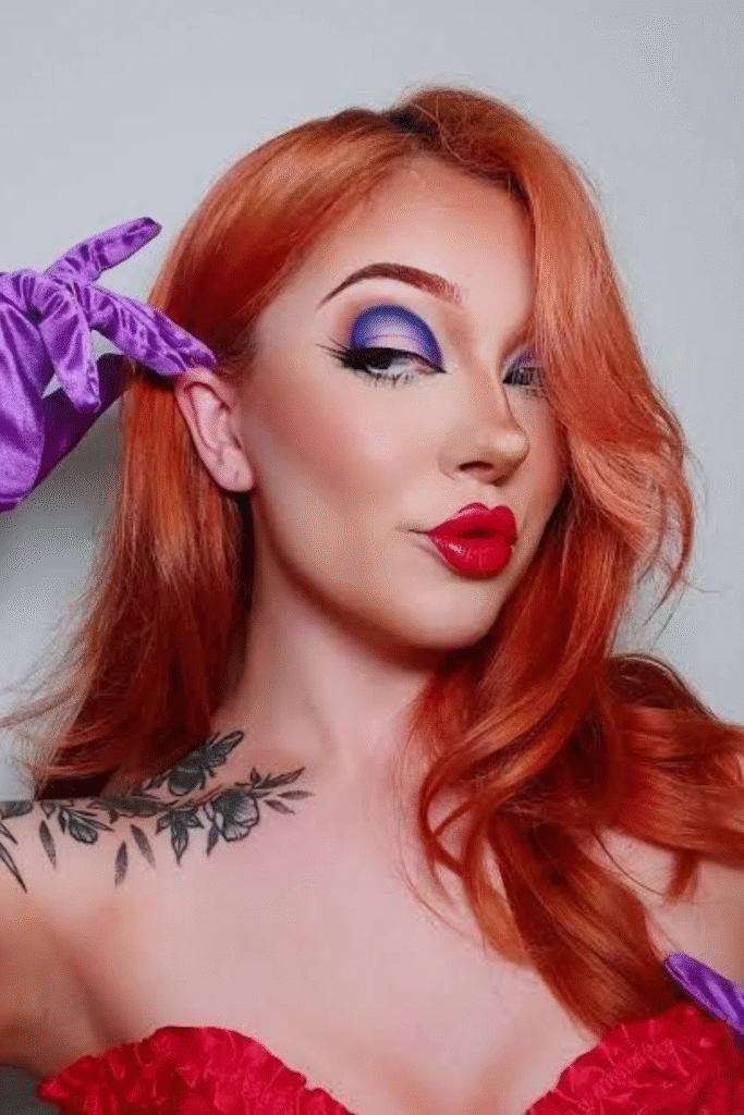 Sultry and glam, this look is perfect if you want to be more mysterious than scary. Think bold red lips, purple eyeshadow, and exaggerated lashes. Add a red wig, and you’re channeling pure cartoon bombshell energy.