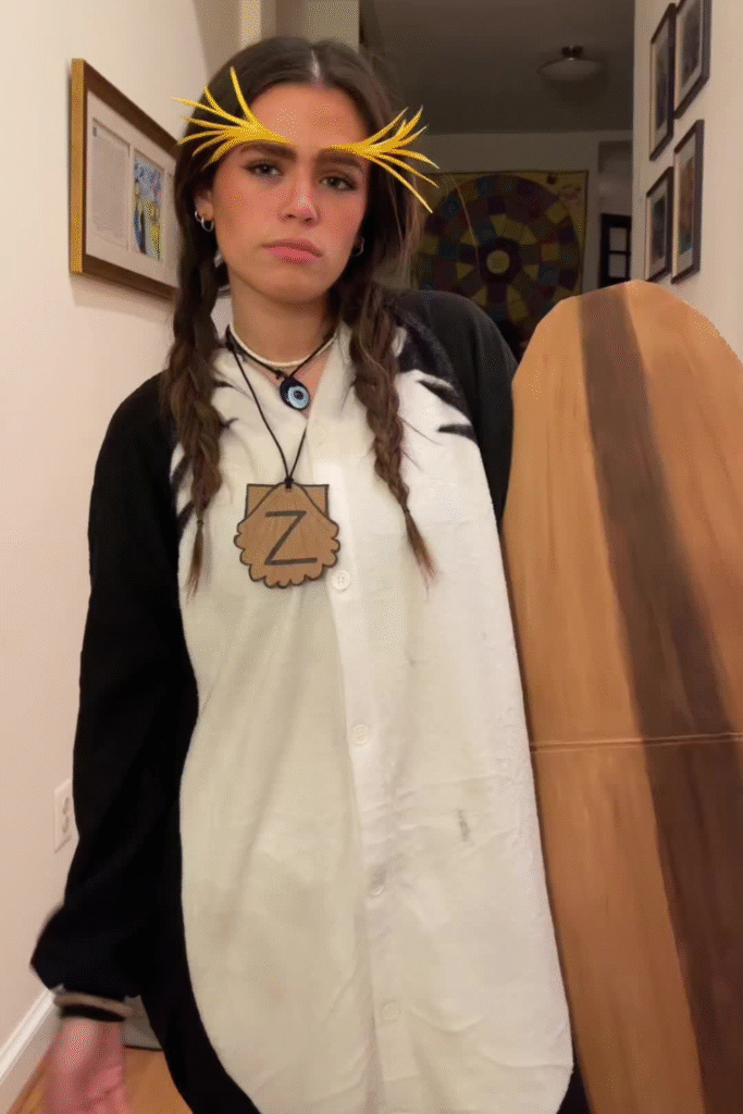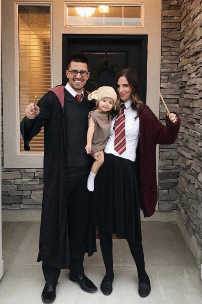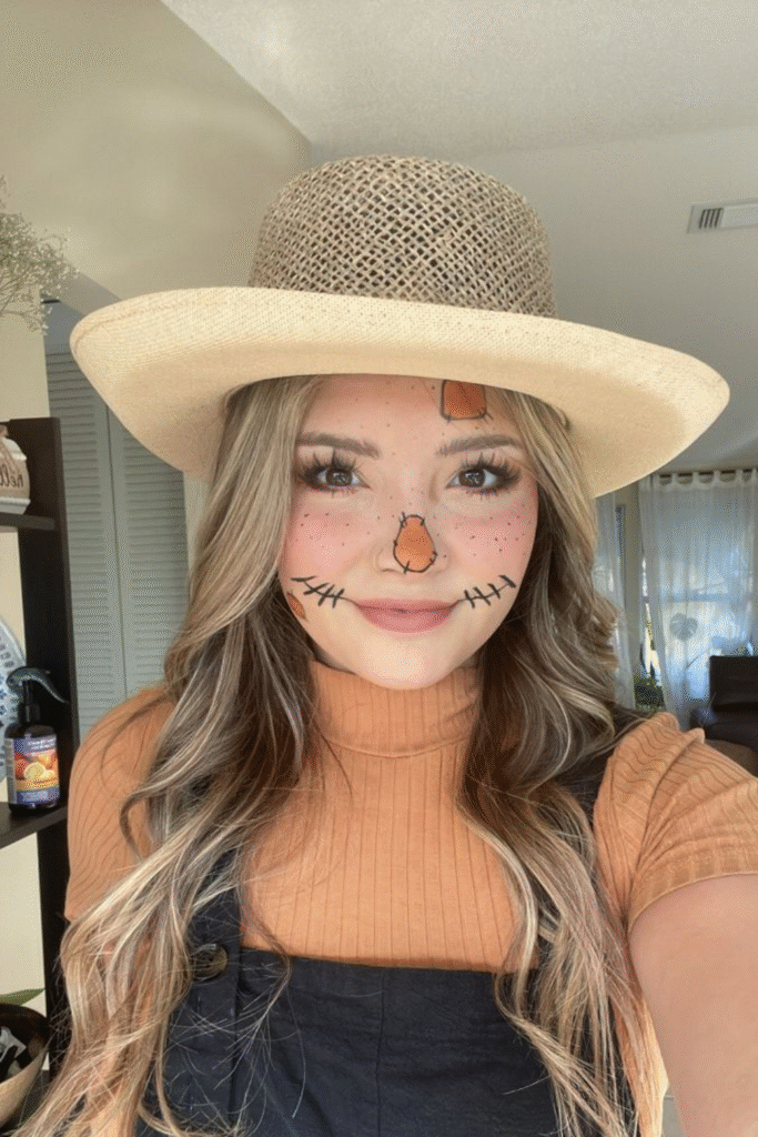 A Halloween classic that’s both adorable and a little spooky. With stitched lines around your mouth, rosy cheeks, and a straw hat, you’re good to go. Add a plaid shirt for the full effect.