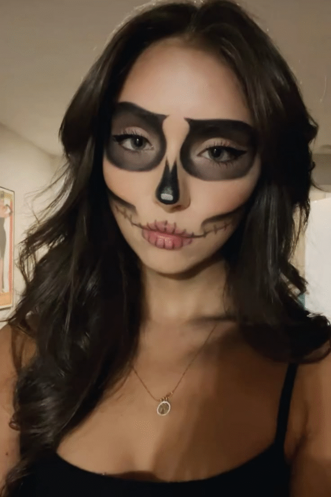 For something spooky but still super cute, draw little bats fluttering across your cheeks or forehead. It’s minimalist but instantly gives off Halloween energy. Pair with a smokey eye, and you’re party-ready in minutes.