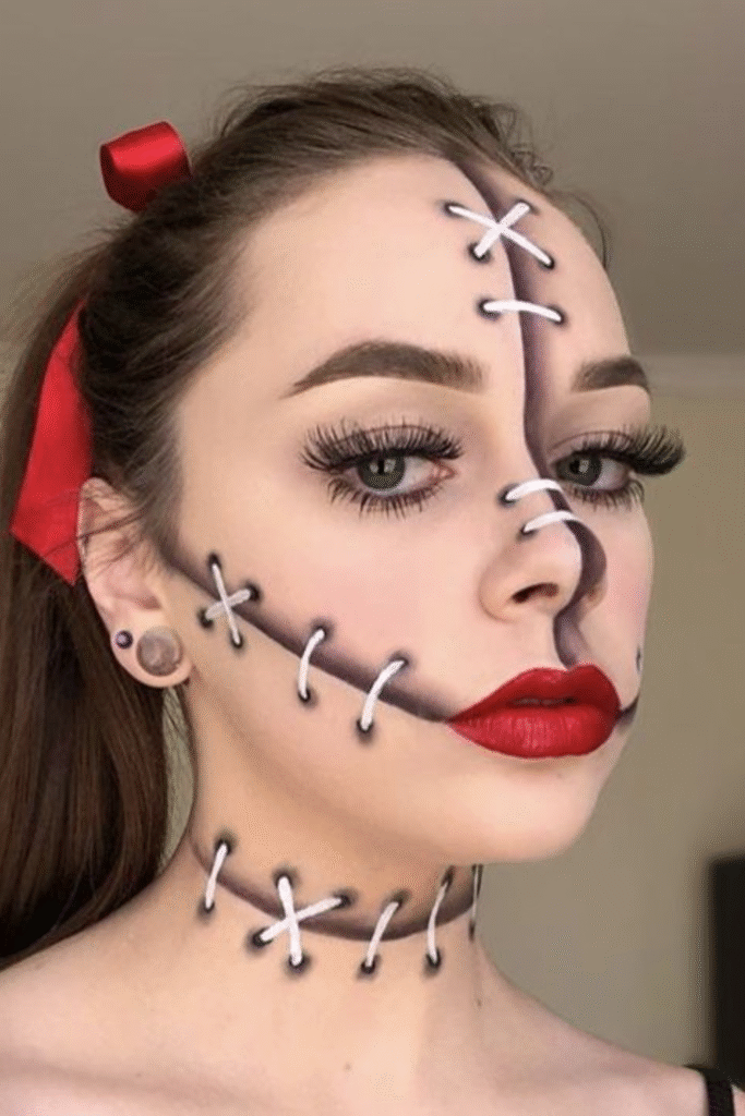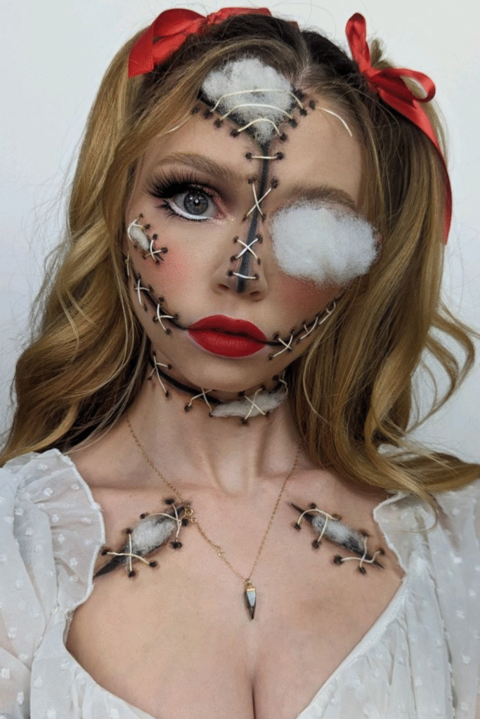 Take a childhood classic and give it a creepy twist. Paint on stitched marks across your cheeks and forehead, then add tufts of cotton stuffing popping out to look like your face is breaking apart. It’s sweet meets sinister—perfectly unsettling.