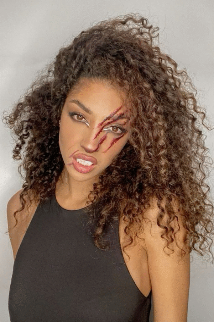 Nothing screams Halloween like going full werewolf. Think messy hair, dramatic contour, and of course, some wild-looking fangs to finish it off. Add furry brows and sharp cheekbones, and you’ll look like you’re mid-transformation.