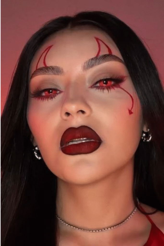 This one’s devilishly simple but seriously effective. Draw little horns above your brows and extend a red tail coming from the corner of your eye. Add a bold red lip, and boom—you’re the cutest devil in the room.