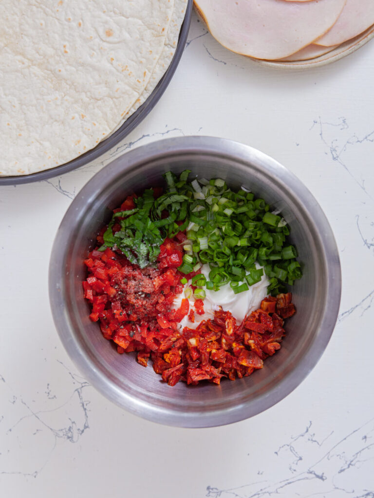 In a medium bowl, add the softened cream cheese, sour cream, chopped sun-dried tomatoes, red bell pepper, scallions, and that fresh basil. Give it a good stir until everything’s nicely combined. Season it with a little sea salt and cracked black pepper to taste. This mixture is chef’s kiss and honestly delicious enough to eat with a spoon (I won’t judge if you sneak a bite).