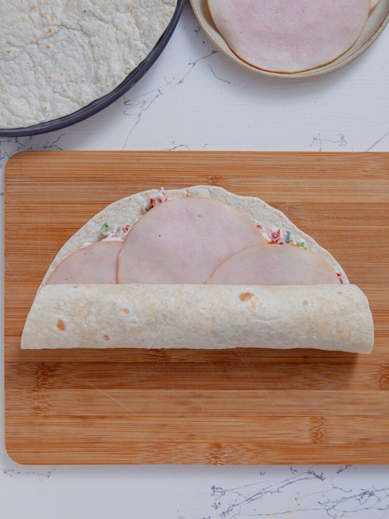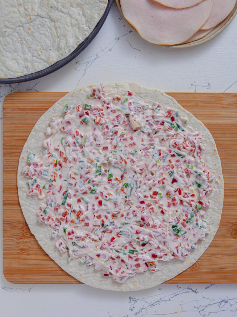 Divide the cream cheese mixture into two equal parts. Grab a tortilla and spread one half of the mixture evenly over it—an offset spatula works great here, but the back of a spoon will do the trick too. Then, layer on 4 slices of turkey, slightly overlapping to cover the whole thing.