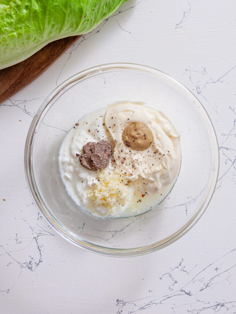 - Prepare the dressing by combining the mayonnaise, Greek yogurt, lemon juice, garlic, Dijon mustard, and anchovy paste in a medium-sized bowl. Season with salt and black pepper, to taste, and whisk to combine.