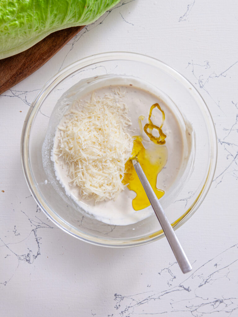 - Add grated Parmesan cheese to the dressing and stir to combine. Slowly drizzle the olive oil into the dressing and whisk until thoroughly incorporated into the mixture. Taste and season with additional salt and black pepper, if needed. Cover and refrigerate until ready to use.