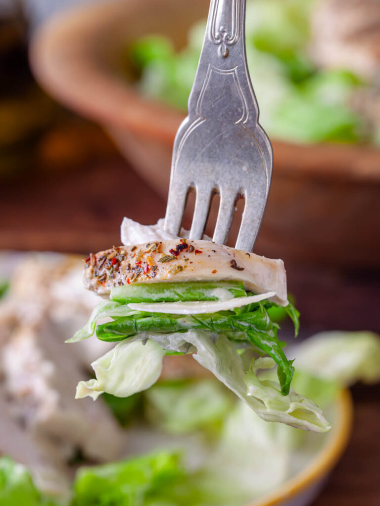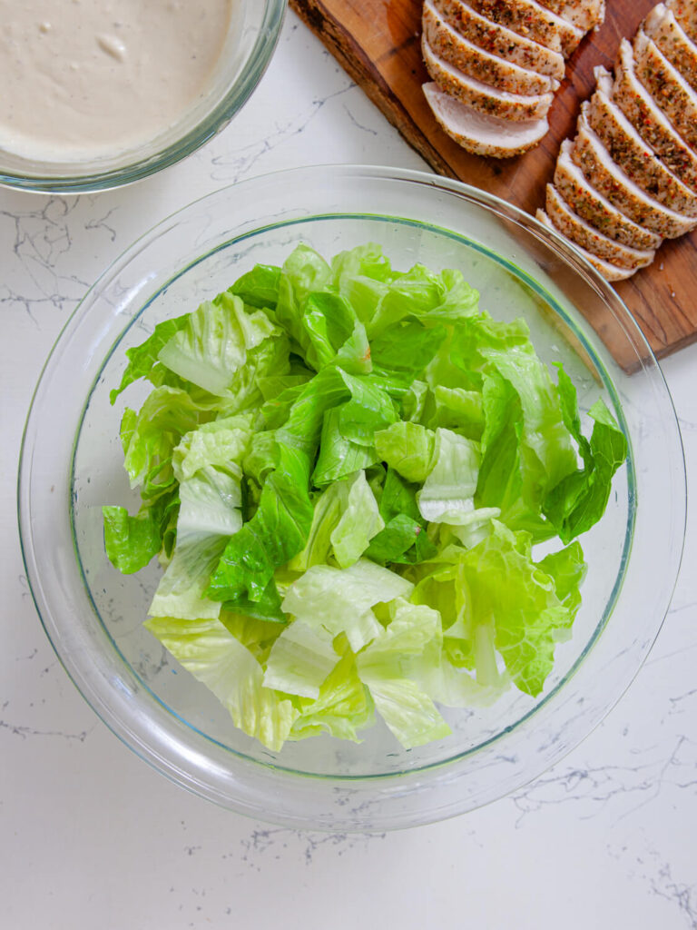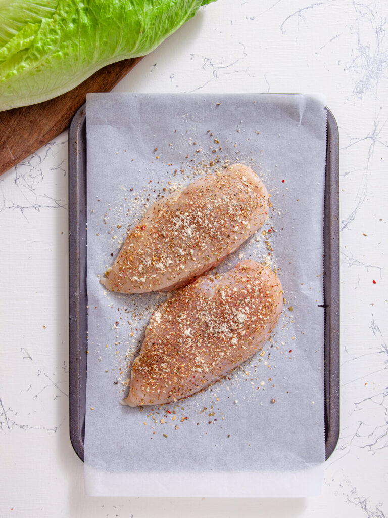 And the chicken? We’re keeping it simple. A quick roast in the oven with Italian seasoning, garlic powder, salt, and pepper. No fancy marinades or breading — just juicy, flavorful chicken that pairs perfectly with the crisp lettuce and creamy dressing.