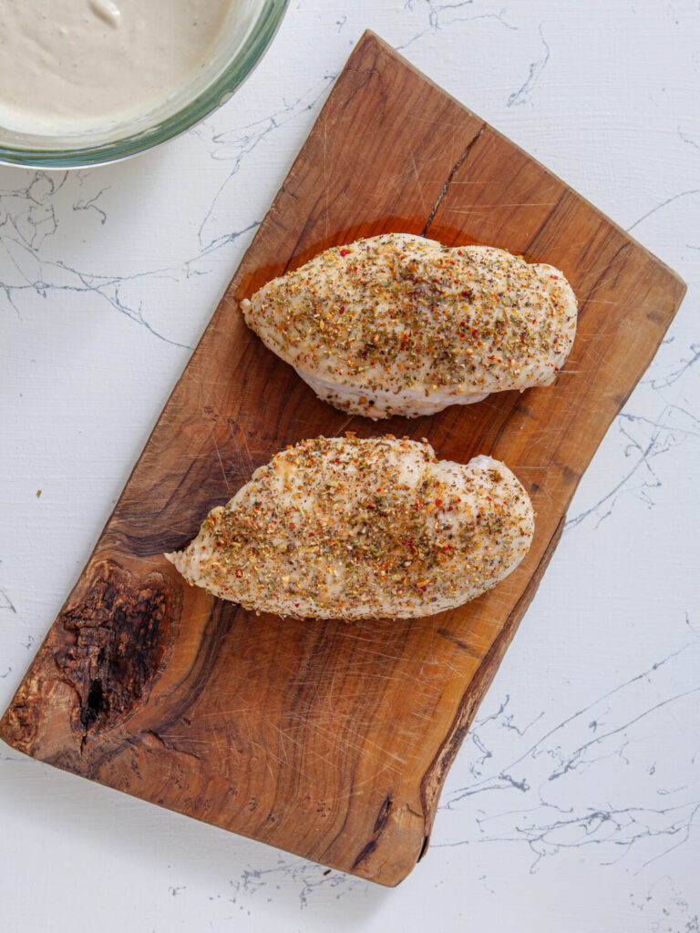 Preheat your oven to 400°F and line a large baking sheet with parchment or a Silpat™ for easy cleanup. Place the chicken breasts on the sheet and sprinkle evenly with Italian seasoning, garlic powder, salt, and pepper.