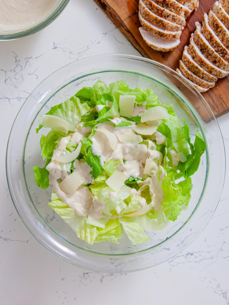 - To serve, assemble the salad by adding the chopped Romaine lettuce to a large mixing bowl. Add the shaved Parmesan and drizzle with 1/3 cup dressing. Gently toss to combine.