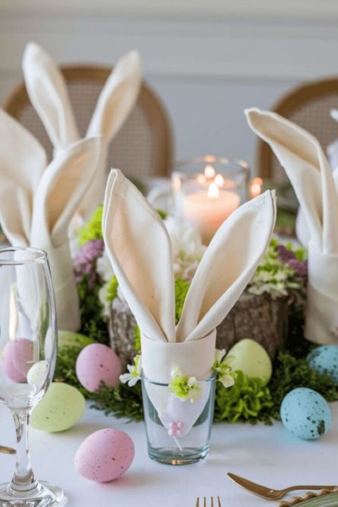 Fold pastel napkins and tuck them into clear glasses so they stand up like little bunny ears. It’s simple, unexpected, and instantly makes each place setting feel festive. This works especially well if you scatter mini eggs around the base for extra charm.
