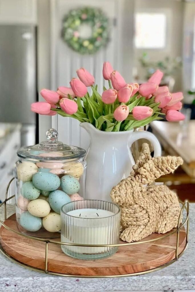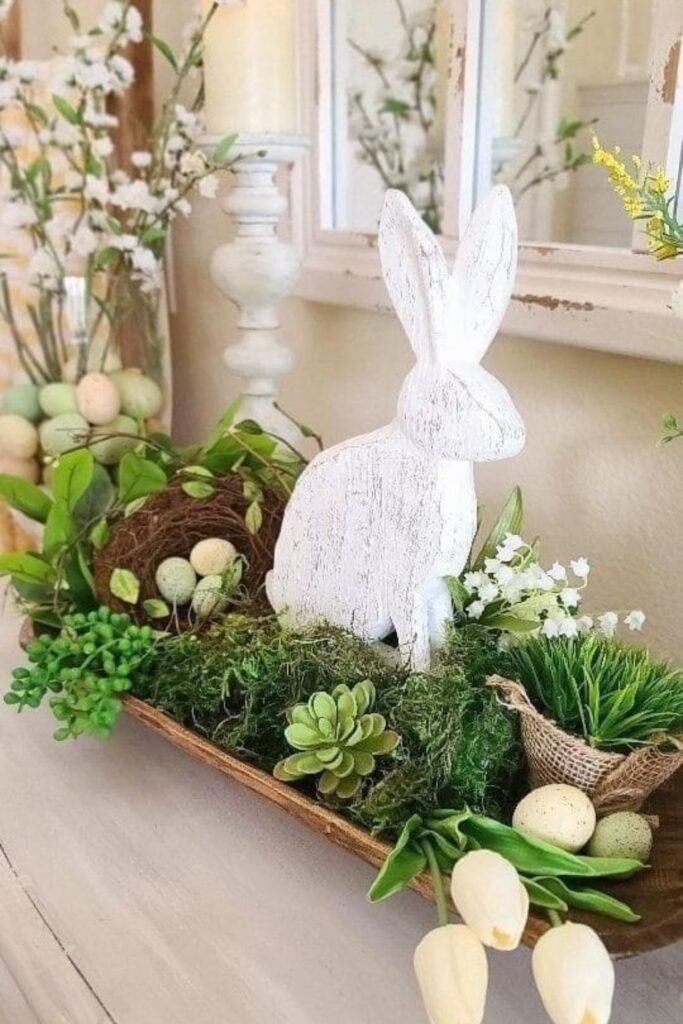 Use a large serving dish as a base, then add a wooden bunny, faux greenery, and a few pastel eggs. The mix of natural textures and soft colors gives it that cozy spring garden feel. It’s like bringing a little outdoor magic to your table.